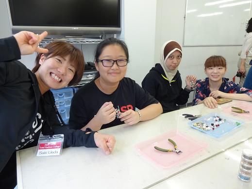 女の子は日本らしく、和柄の布を使ったつまみ細工とビーズでキーホルダーを